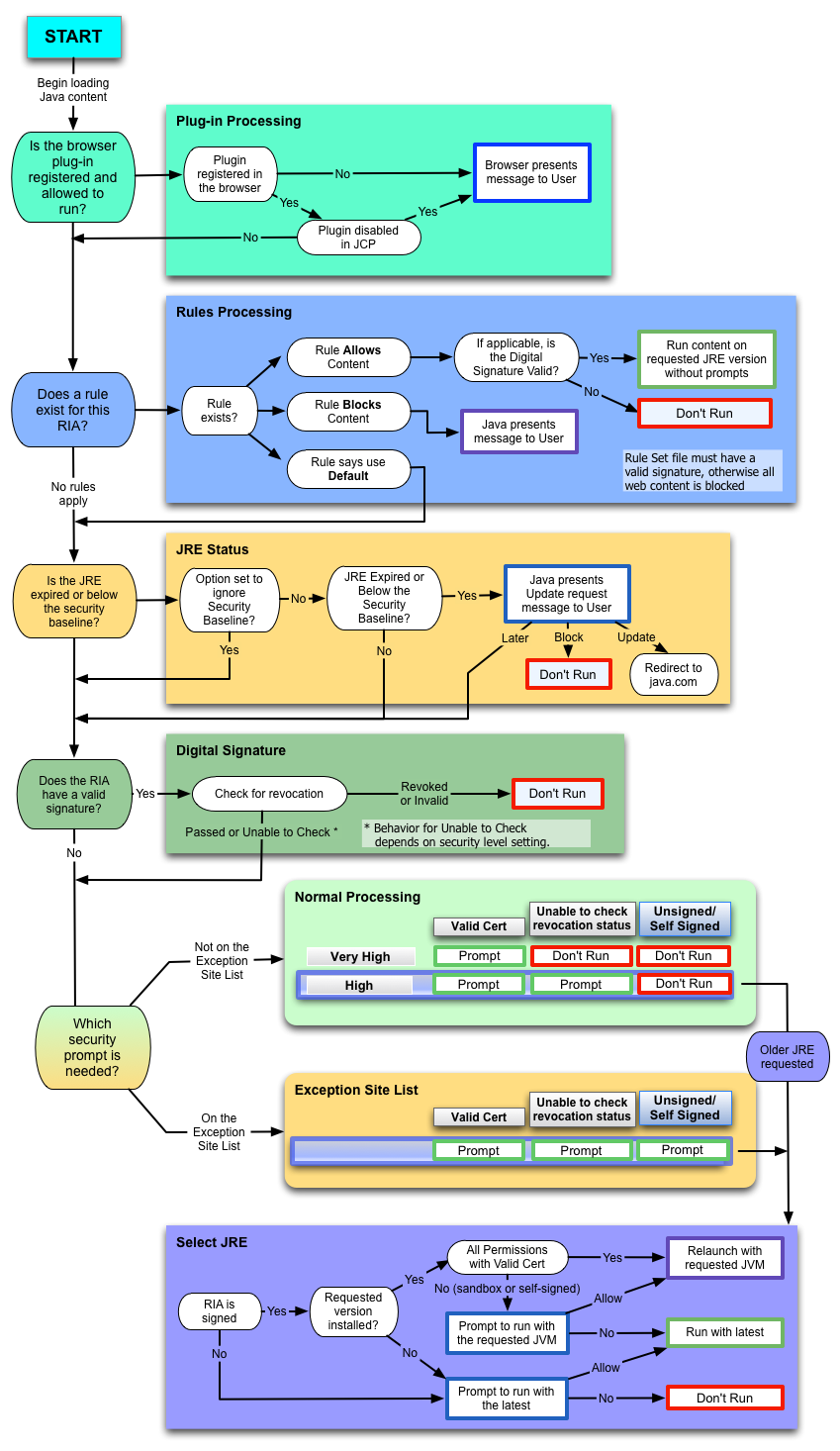 When a user launches a Java or JavaFX application that is embedded in a browser or is started from a browser, collectively called Rich Internet Applications (RIAs), a number of checks are made to determine if the RIA is allowed to run, which version of the JRE is used, and which security prompts are shown to the user. The purpose of this topic is to explain those checks and show how the decisions are made.